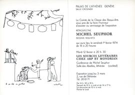 Cm 21x15. . . Molto buono (Very Good). . . .<p>Pieghevole d'invito alla mostra di Michel Seuphor presso il Palais de l'Athen&eacute;e, Gen&egrave;ve, 1 febbraio 1974. Un testo di <strong>Jean Arp </strong>e 2 illustrazioni</p> Cm 21x15. . . Molto buono (Very Good). . . .