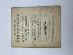 In 8 (cm 18 x 21,5), pp. XXXV + (1 bianca). Brossura rifatta con carta d'epoca. Pubblicazione per le nozze del barone Sant'Agabio di Vercelli con Paola Carcani di Milano. Con un testo introduttivo curato da "lo studioso Accademico Intronato di Siena". Seguono rime degli autori, alcuni dei quali firmano con i loro pseudonimi ovvero:Ilisso Glafiride, Giambattista Giovio, Metideo P.A., Tranquillo accademico immobile, Corillo Agorio, Francesco Franchi, l'abate Saverio Riva, Giambattista Marcucci lucchese e Accademico Oscuro, Giambattista Montecatini Accademico oscuro, Francesco Cini, Ipparco Cappello bresciano, Bernardo Salvoni parmigiano, Dott. Barilli tra gli Arcadi della Colonia Eridania Narcete Cinurense, Capitano Petrignani Albicini forlivese, ecc... Cfr. Di Domenico, "Per le faustissime nozze. Nuptialia della Biblioteca Braidense (1494-1850)", p. 104.