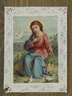 Titolo: Santino: GESU' BAMBINO E COLOMBI. Cromolitografia, cornice trinata - Circa - 1880