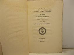 In 8, pp. 39 + (1b) con vignette xilogr. n.t.. Br. edit. con graziose decorazioni tipografiche ai p. Qualche alone ai piatti e lieve gora al marg. sup. delle cc., per il resto bell'esemplare di questa pubblicazione contenente i sette Psalmi petrarcheschi in latino con volgarizzamento italiano a fronte in terzine libere di Angelo Dalmistro.