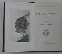 Cm. 23, pp. (4) 472 (88). Antiporta figurata (Passo e Cima di Ball su carta pesante), 7 figure su due tavole raffiguranti l'Adamello, una carta della zona Riva-Pinzolo e la raffigurazione dell'Edelweiss. Solida legatura del tempo in mezza percallina con punte e titoli in oro sl al dorso. Ottimo stato di conservazione. Dall'indice: TARAMELLI T. Significato geologico del paesaggio alpino, PISCHL A. Serrada e i suoi monti, BOLOGNINI N. Usi e costumi del Trentino, CESARINI SFORZA L. Monte delle rose, CHIESA G. Dal Leno al Leogra, CAPRARO T. La valle di Sella in Valsugana, MARTINI, A. Le ferrovie di montagna, CANELLA, G. Da Riva a Brescia, Valle di S. Valentino. Val di Fumo.