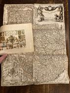 In-4° oblungo (280x200mm), cartoncino moderno. Comprende un frontespizio calcografico con stemma del Duca di Savoia sorretto da leoni rampanti, titolo entro cartiglio e, tutt'attorno, 20 stemmi di città del Ducato di Savoia, il tutto in coloritura manuale coeva, e, di seguito, due tavole calcografiche con complessive 18 vedutine in b.n. di città (Casale, Pinerolo, Chambéry, Susa, Carmagnola, Saint Jean de Maurienne, Vercelli, Aosta, Barcelonnette, Cuneo, Verrua, Trino, Savigliano, Tenda, Ivrea, Oneglia, Carignano, Villafranca) e una carta ripiegata disegnata dal Coronelli (con restauri al verso) degli Stati di Savoia, con titolazione inscritta entro cartouche sormontata da corona e sorretto da quattro putti. La carta, in scala in miglia d'Italia, misura dispiegata 600x440 mm. La carta, fra le più belle e dettagliate realizzate in antico del territorio piemontese, riprende quella del Corso Geografico Universale del Coronelli, pubblicato a Venezia nel 1693.