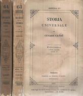 Storia universale di Cesare Cantù, dispensa 63 e 64, letteratura volume II parte I e II. Edizione del 1847 in due volumi in brossura in discreto stato di conservazione, la copertina della parte seconda è strappata. Il dorso è ancora integro, scuro, ma leggibile, le pagine all'interno sono candide, con fioritura sparsa. numero pagine 745