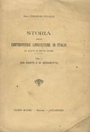 Catanzaro, Guido Mauro, 1925, in-8, br. edit., pp. (8), 245, (3). Strappo restaurato all’angolo inf. esterno della cop. ant. Apparso con titolo diverso (Le controversie intorno alla nostra lingua dal 1500 ai nostri giorni) nel 1894-95 in 2 volumi, a cui si era aggiunto un 3° (La questione manzoniana) nel 1898; questa edizione è però (asserisce l’autore in prefazione) rifatta totalmente: questo volume è dedicato alle controversie sulla lingua dal sec. XIV al XVIII.