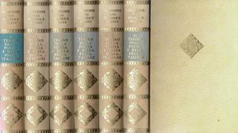 Opera completa in VI tomi, muniti di espositore da tavolo in cartone vellutato. Legature commerciali, formato tascabili, copertine rigide mute ai piatti e titolate a oro alle coste, in ottime condizioni di conservazione, appena ingiallite e scolorite dall'esposizione alla luce, altrettanto ben conservati appaiono gli interni dei volumi, con carte, velate da delicati toni bruni corredate da nastrini segnapagina, immacolate e perfettamente fruibili. N. pag. 318 ogni volume.