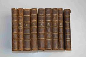 Nove volumi di cm. 17,5, pp. 2500 ca. complessive. Frontespizi in rosso e nero, antiporta al primo volume e 23 tavole f.t. Il tutto inciso in rame. Legatura coeva in piena pelle, dorso a nervi con filetti in oro, piatti inquadrati da duplice filetto. Qualche traccia d'uso sparsa, peraltro esemplare abbastanza genuino ed in buono stato di conservazione.