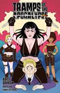 **Alice Darrow (Futurama, Disenchantment, Exploding Kittens) brings her animation talents to comics with Tramps of the Apocalypse! Welcome to the future. Earth may be a glorified landfill ruled by Neo-Reaganism, testosterone, and off-brand ED medication but Earth’s apex predator remains: big, buxom, bountiful, bodacious, beastly, bone-chilling, blood-curdling…WOMEN.** The year is 2094, and men rule the world. So what has changed in seventy years, you ask? Following the ten-year Sildenafil wars of 2053, Earth has become a barren wasteland. Factions of surviving men led by “Quest Ragnor, King of Males” have taken over the remnants of cities and towns across the globe, capturing and enslaving all women…Well, all women except for three super bimbos with unparalleled bloodlust and an unquenchable thirst for violence: Baby, Belladonna, and Babette. Unwilling to bend to the whims and desires of the buffoons in charge, too slippery to be caught, and too sexy for chains, these three bangin’ babes are at the top of Quest Ragnor’s most wanted list. Unfortunately for him, they couldn’t care less. But when Baby, Belladonna, and Babette come across Cecil, a male who claims to know of a sacred artifact that could lead to the downfall of man, the babes see an opportunity to finally, truly be free. Collects Tramps of the Apocalypse #1–#3.