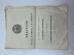 In folio (cm 28,5 x 42 circa), 4 bifogli sciolti (16 pp.) con testo stampato su due colonne in francese e traduzione italiana. Qualche foro all'ultima carta bianca. Pubblicazione di questo trattato di commercio, composto da 21 articoli, stipulato a Costantinopoli il 12 febbraio 1833, e approvato a Firenze il 2 maggio dello stesso anno, tra Leopoldo II e l'Imperatore degli Ottomani Mahmoud II. Leopoldo II vedeva riconosciuto alle proprie navi, coperte dalla bandiera granducale e non piu' dal vessillo imperiale austriaco, l'accesso al Bosforo e al Mar Nero. Era inoltre prevista l'esistenza di consoli fiorentini nei porti del Levante, il tutto quale conseguenza diretta della completa autonomia raggiunta nel frattempo dal Granducato nei confronti di Vienna.