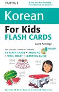 A fun and kid-friendly introduction to Korean! The Tuttle Korean for Kids Flash Cards kit is an introductory Korean language learning tool especially designed to help children from preschool through early elementary level acquire basic words, hangul script, phrases, and sentences in Korean in a fun and easy way. The flashcards can be used as a learning tool in a classroom setting, at home, or anywhere that learning takes place, and can easily be taped around the room for an interactive way to learn Korean. The set contains a total of 64 words organized into thematic categories, including: My Family, Colors, Numbers, My Day, Food, My Body, Clothes, and Going Places. All of the words are illustrated--the pictures serve as effective visual aids to help children learn and remember each word's meaning. Words often reflect cultural objects and items and can be studied in any order. Learners may focus on one theme at a time or mix them up for a little more variety.