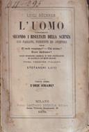 "Facile esposizione corredata di note giustificative ed illustrata con molte incisioni. Prima versione italiana di Stefanoni Luigi" - Brossura editoriale di xxiv-175 pagine, incisioni in nero nel testo. Evidenti segni del tempo, note d'inventario privato al piatto anteriore, testo ben leggibile; copia più che accettabile nel complesso -- Prima parte di un'interessante opera relativa all'Evoluzionismo e alla Filosofia Positivista..
