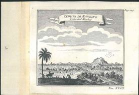 Incisione in rame su carta vergata mm. 212x146, parte incisa mm.120x136 con primo piano animato da uomini e cavalli, il fiume Azzurro, i ponti e sullo sfondo la città di Nanchino protetta da mura. Immagine tratta da: Storia generale dè viaggi, 1755 circa