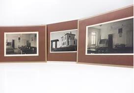 Tre fotografie originali in b/n vintage, stampa alla gelatina ai sali d'argento, didascalie manoscritte al verso, ognuna montata su un cartoncino bordato cm 23 x 17,5. La prima misura cm 14 x 8,8 e raffigura l'esterno della scuola di Vigoponzo in Val Borbera, le altre due cm 15,3 x 10 ritraggono dall'interno la scuola. Il fotografo ritrae un'aula vuota con i banchi, la lavagna con la bandiera dell'Italia e la scritta sul muro 'Quando alla patria si e' dato tutto non si e' ancora dato abbastanza'.