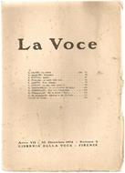 Scritti di G. Papini (3 poesie), A. Baldini (Domenica), A. Soffici (Apollo), F. Pagliai (Le malie della luna), P. Jahier (Isole. Stasera), C. Govoni (La casa della peste. II), G. Bastianelli (La gravitazione dei suoni), G. Prezzolini (Non sono irredentista - Per la nuova ''Voce''), G. De Robertis (Epistola al pio Goffredo). Consigli del libraio 8vo. pp. 144. . Buono (Good). Fioriture alle prime pagine (Yellowing of first pages). Anno VII - N. 2. .