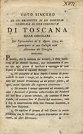 Voto sincero di un residente in un Consiglio generale di una comunità di Toscana sulla circolare del soprassindaco de' 7. agosto 1794. da parteciparsi ai suoi colleghi nell'adunanza del Consiglio medesimo